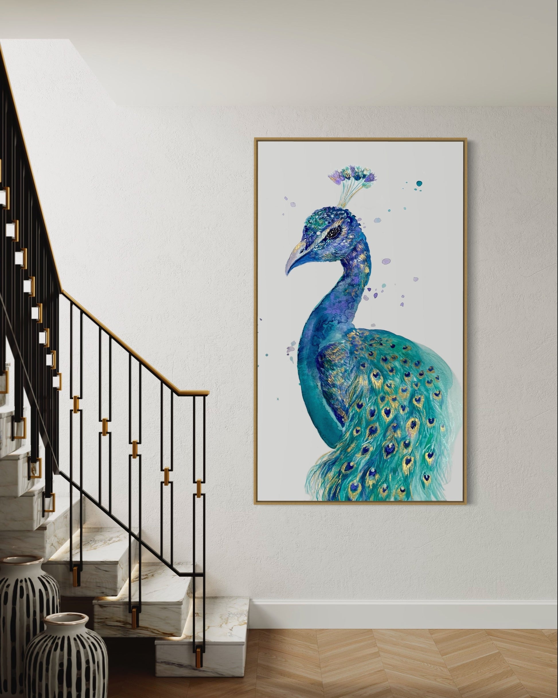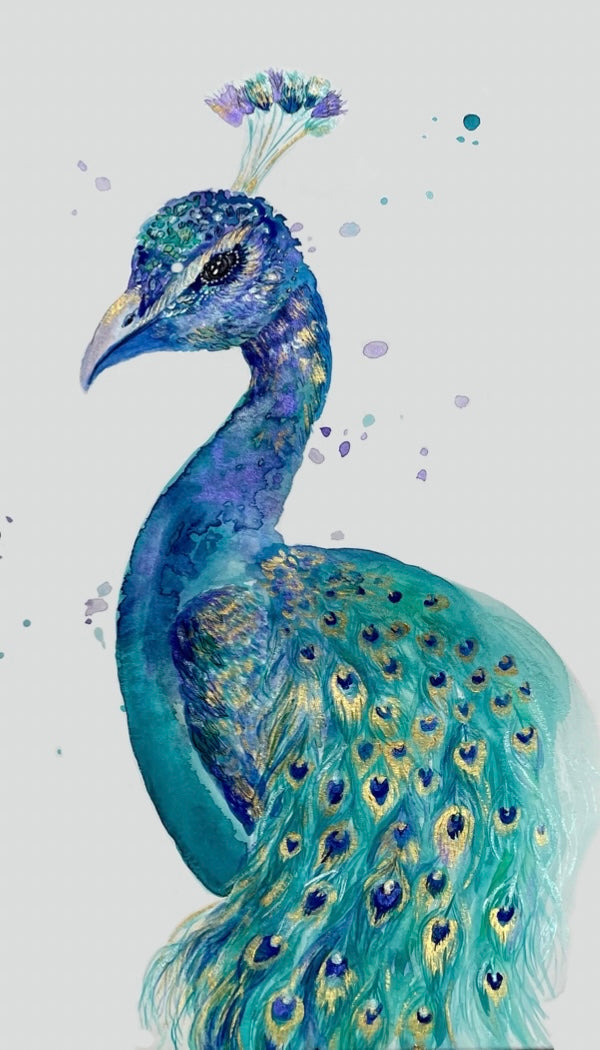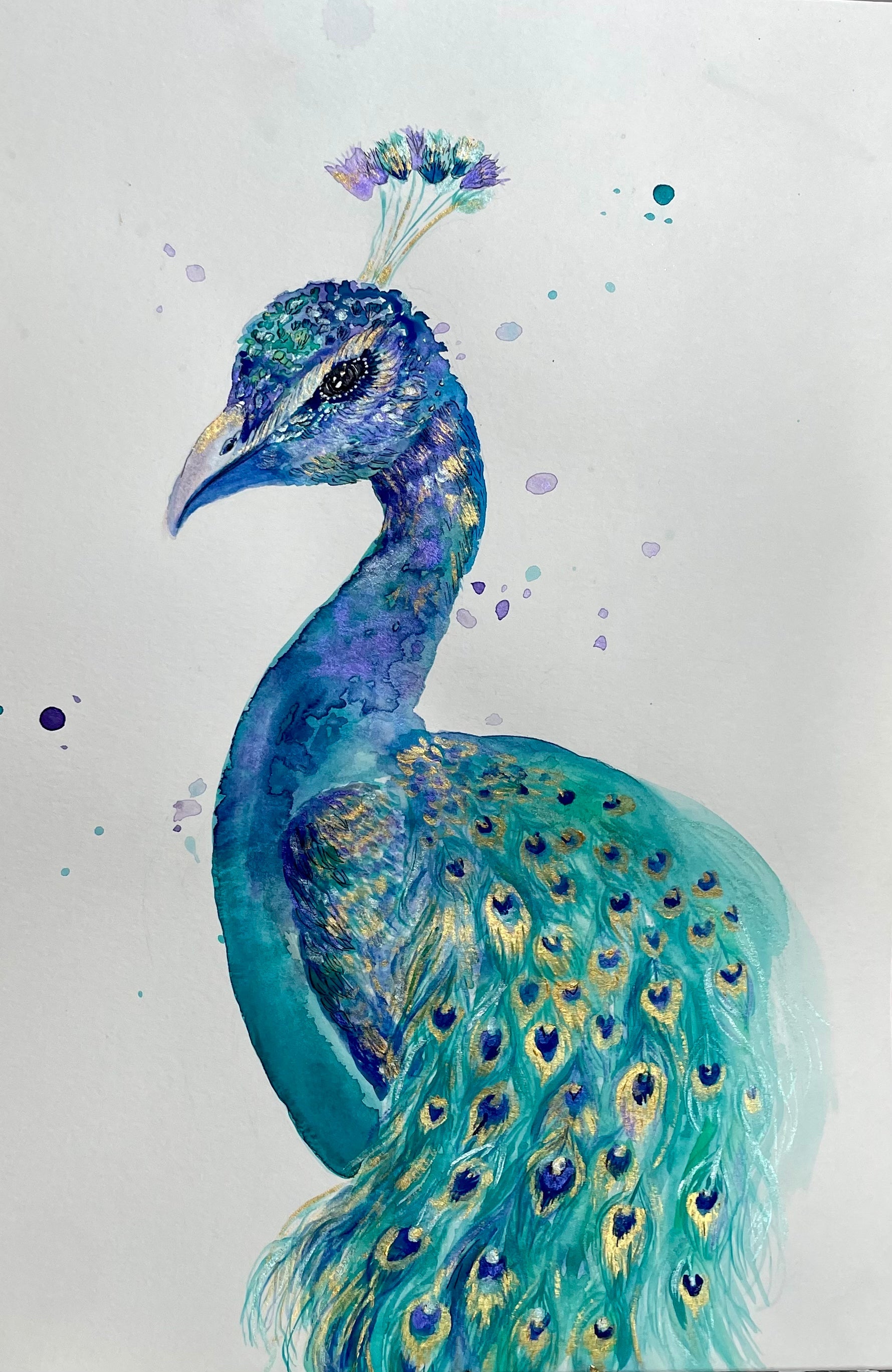 Sold- Original watercolor painting of “Emerald Peacock” showcases an elegant shimmering peacock with gold details. The high-quality print is delicately detailed with shimmering gold accents that are beautifully reflective.