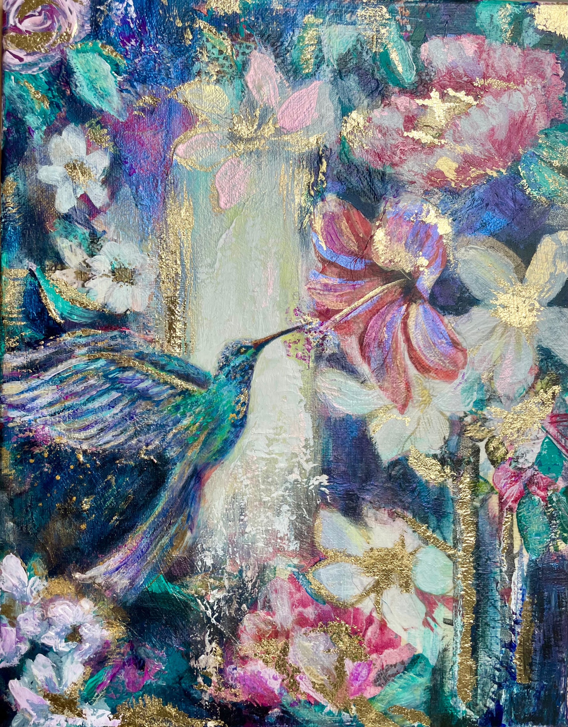 This "Ethereal Oasis" print captures the beauty of nature with its depiction of a hummingbird near a vibrant waterfall, enhanced by jewel tones and gold leaf. Immerse yourself in the ethereal oasis and bring a touch of nature's tranquility into your space.