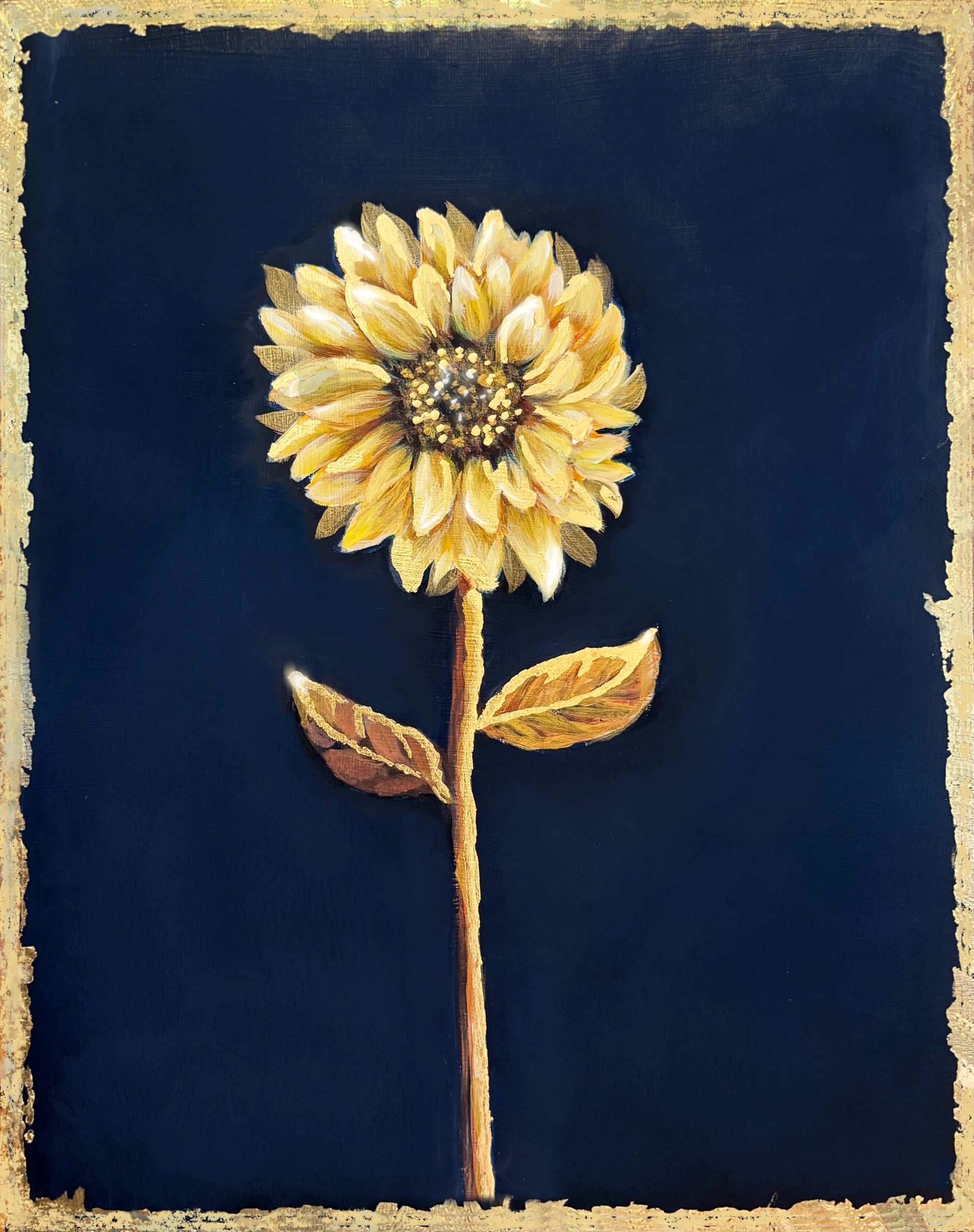 Radiating warmth and strength, Fields of Sunshine features a single bloom rendered in rich, textured brushstrokes. Set against a deep, midnight-blue backdrop, the sunflower glows with soft golden tones, while hand-applied gold leaf edges create a built-in frame that adds elegance and luminosity to the piece.