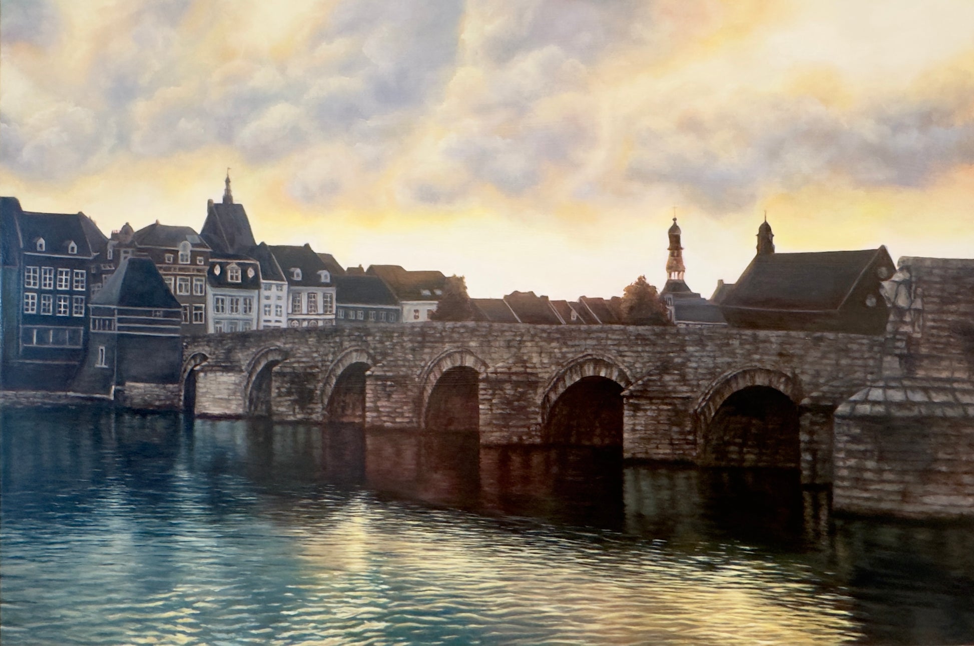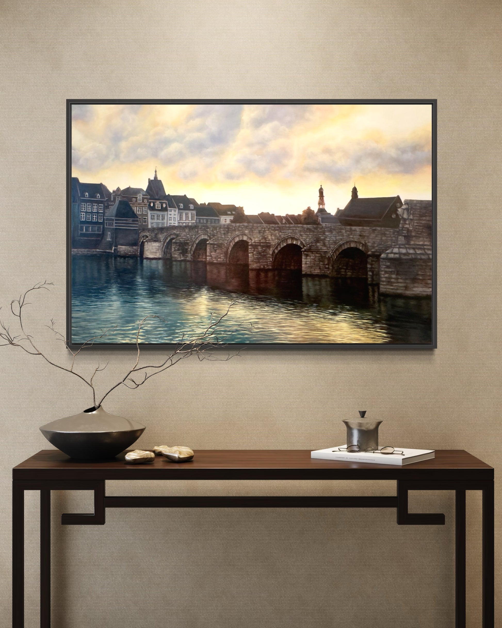 Inspired by a golden sunset in the historic city of Maastricht, Golden Reflections captures the timeless beauty of the St. Servaasbrug (St. Servatius Bridge) as evening light dances across the water. This piece holds special meaning—based on a photo taken by my father during our travels, whose artistic eye continues to inspire my work.