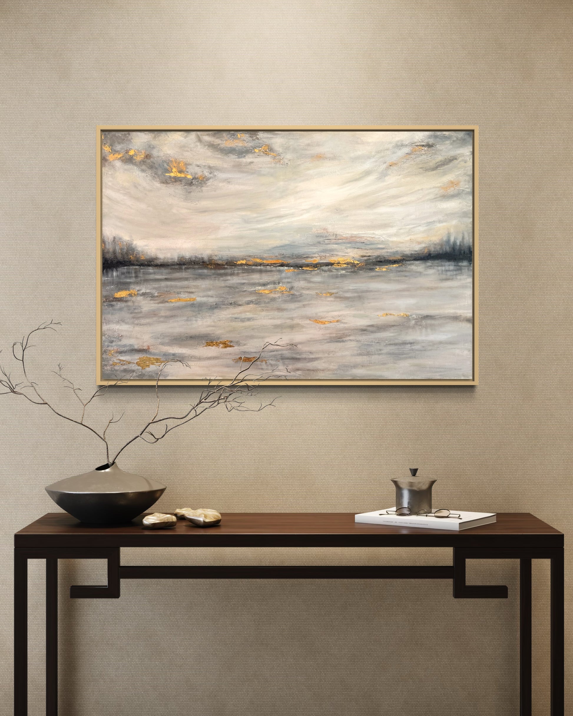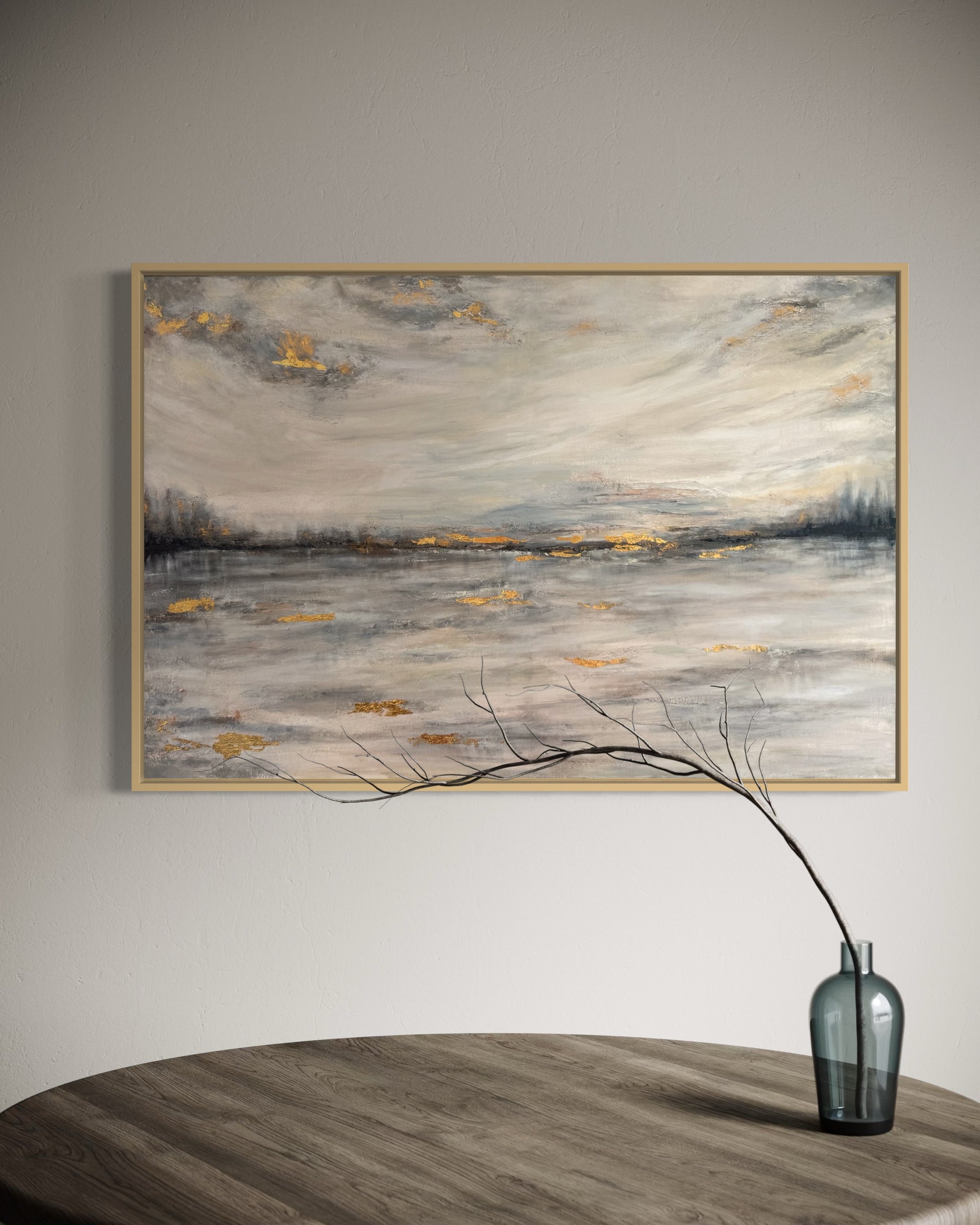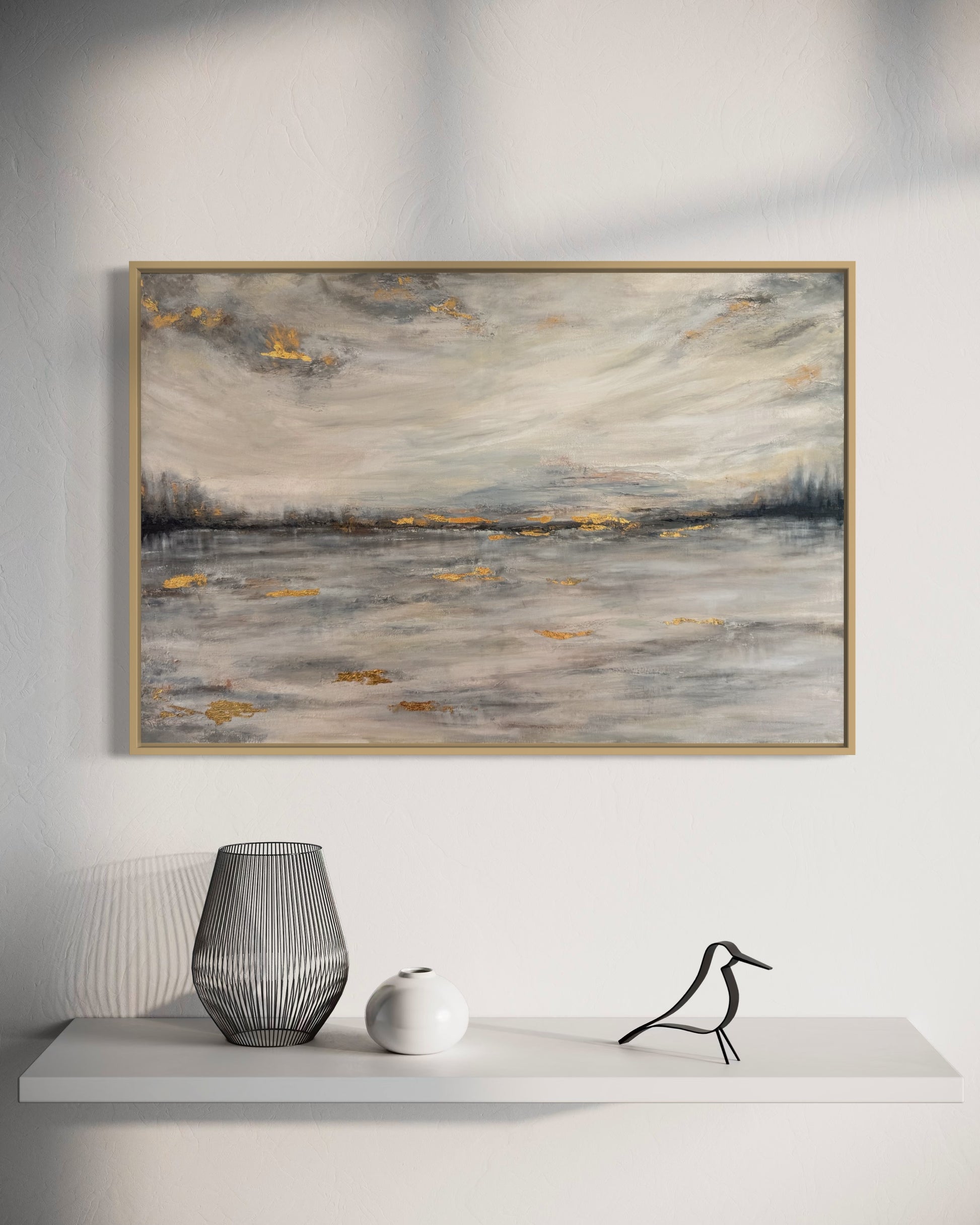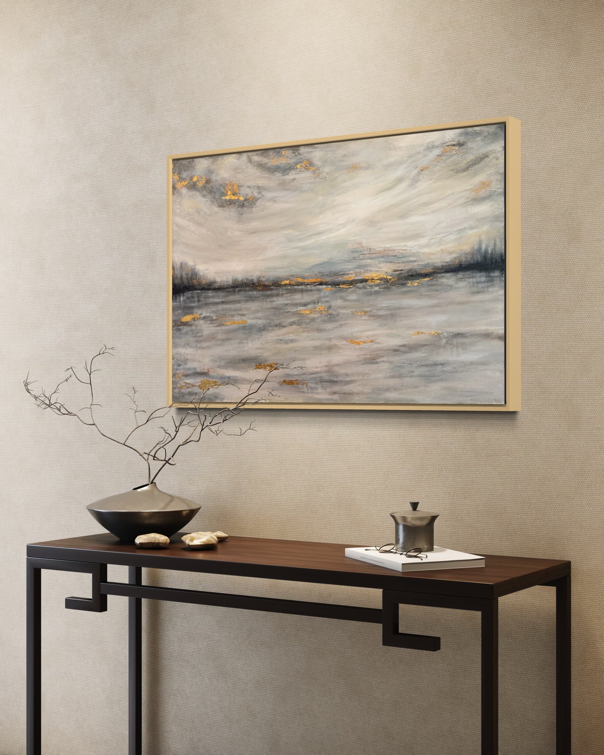 The original 24x36" painting is presented in a sleek floating gold metal frame, adding a touch of modern elegance that enhances its tranquil, sophisticated feel. Whether displayed in a peaceful bedroom, serene entryway, or calming office space, Misty Memories brings a timeless sense of stillness and connection to nature.