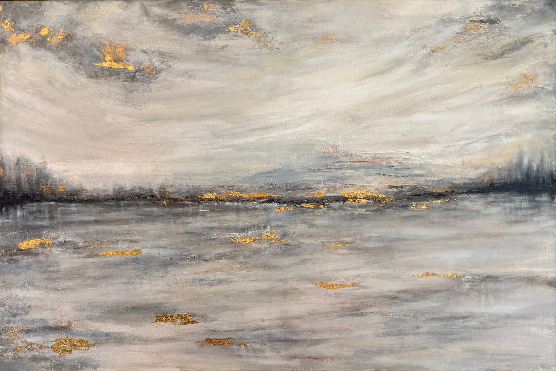 Soft, serene, and deeply reflective, Misty Memories captures the quiet beauty of a misty morning on Minnesota’s North Shore. A calm waterscape stretches across the canvas, framed by a gentle tree-lined skyline fading into the mist. Subtle layers of white, cream, and gray create a soothing atmosphere, while hand-applied gold leaf adds a luminous, elevated finish.