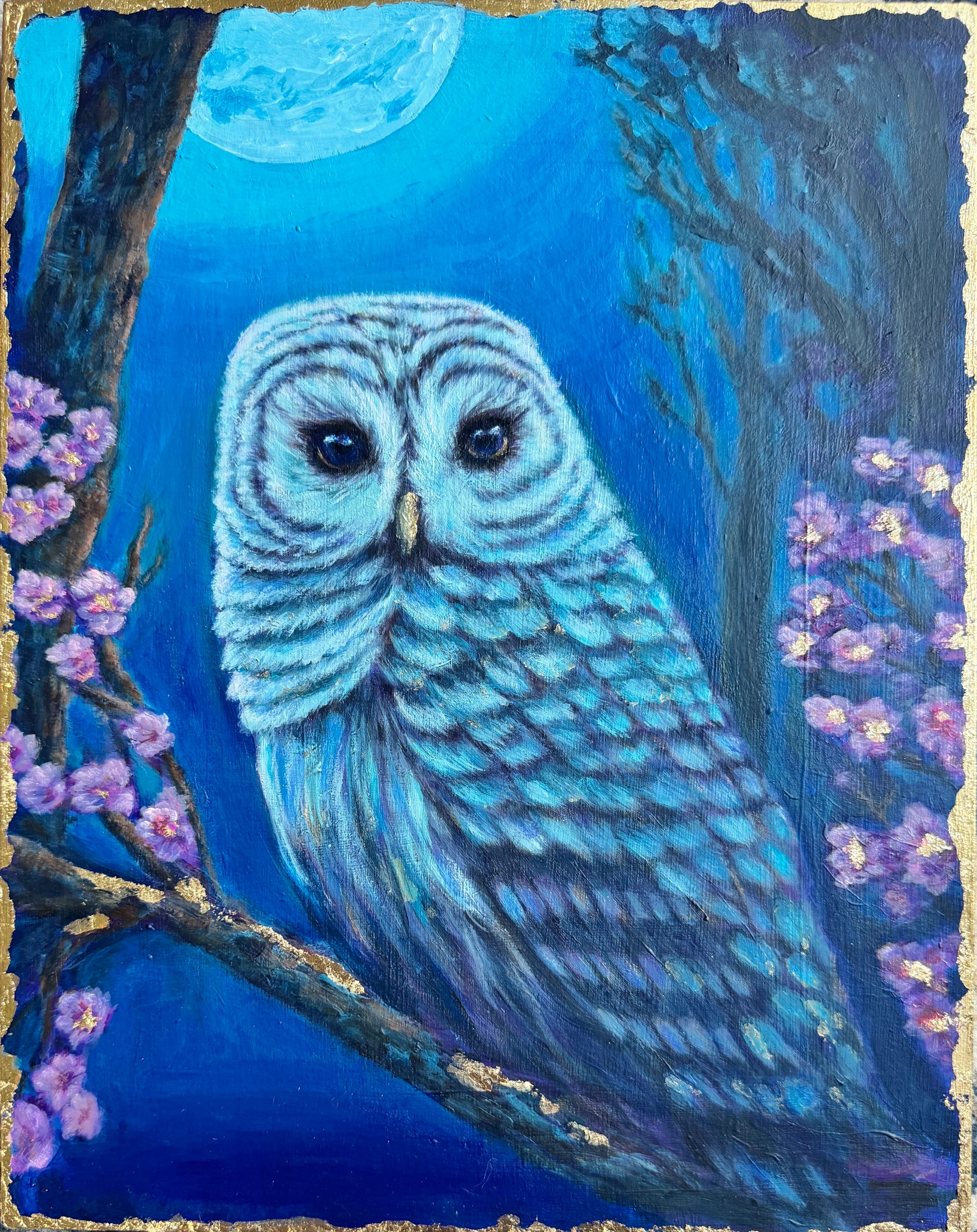 This beautiful owl spent several weeks perched in the trees of my backyard, and her presence felt so magical—I knew I had to paint her.