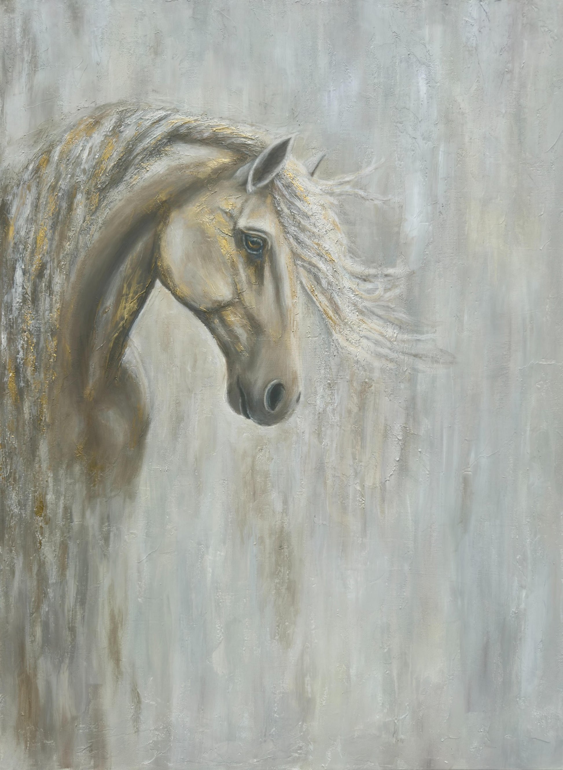 Graceful and powerful, Majestic Light captures the quiet strength of a horse in stillness, illuminated by soft light and flowing motion. Subtle layers of acrylic, texture medium, and hand-applied gold leaf create depth, shimmer, and a sense of timeless beauty.