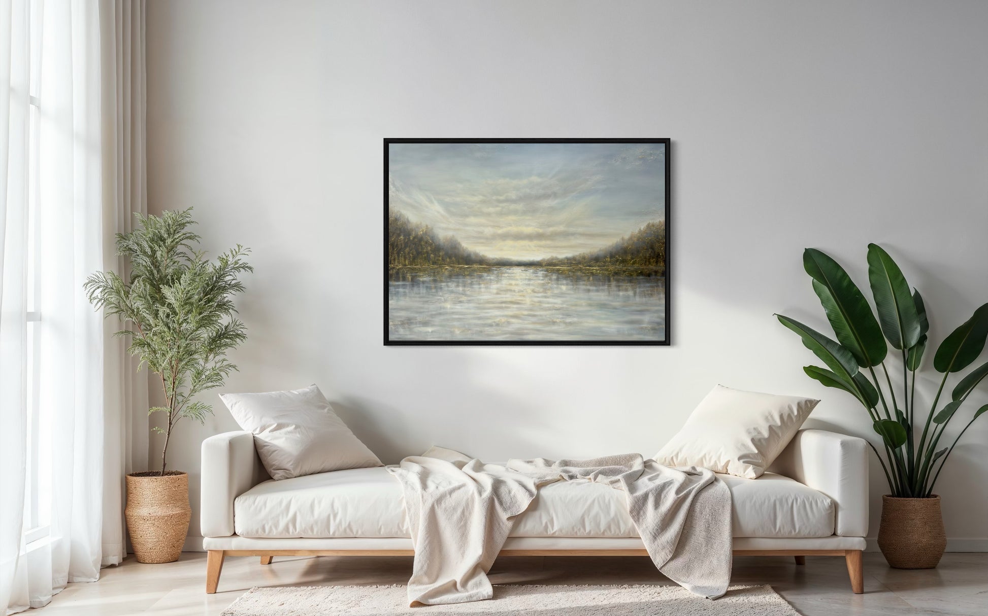 Soft, ethereal skies open to a horizon lined with misty trees, their reflection gently mirrored in the still water below. This piece invites a sense of calm reflection, celebrating the beauty found in fleeting moments of stillness.