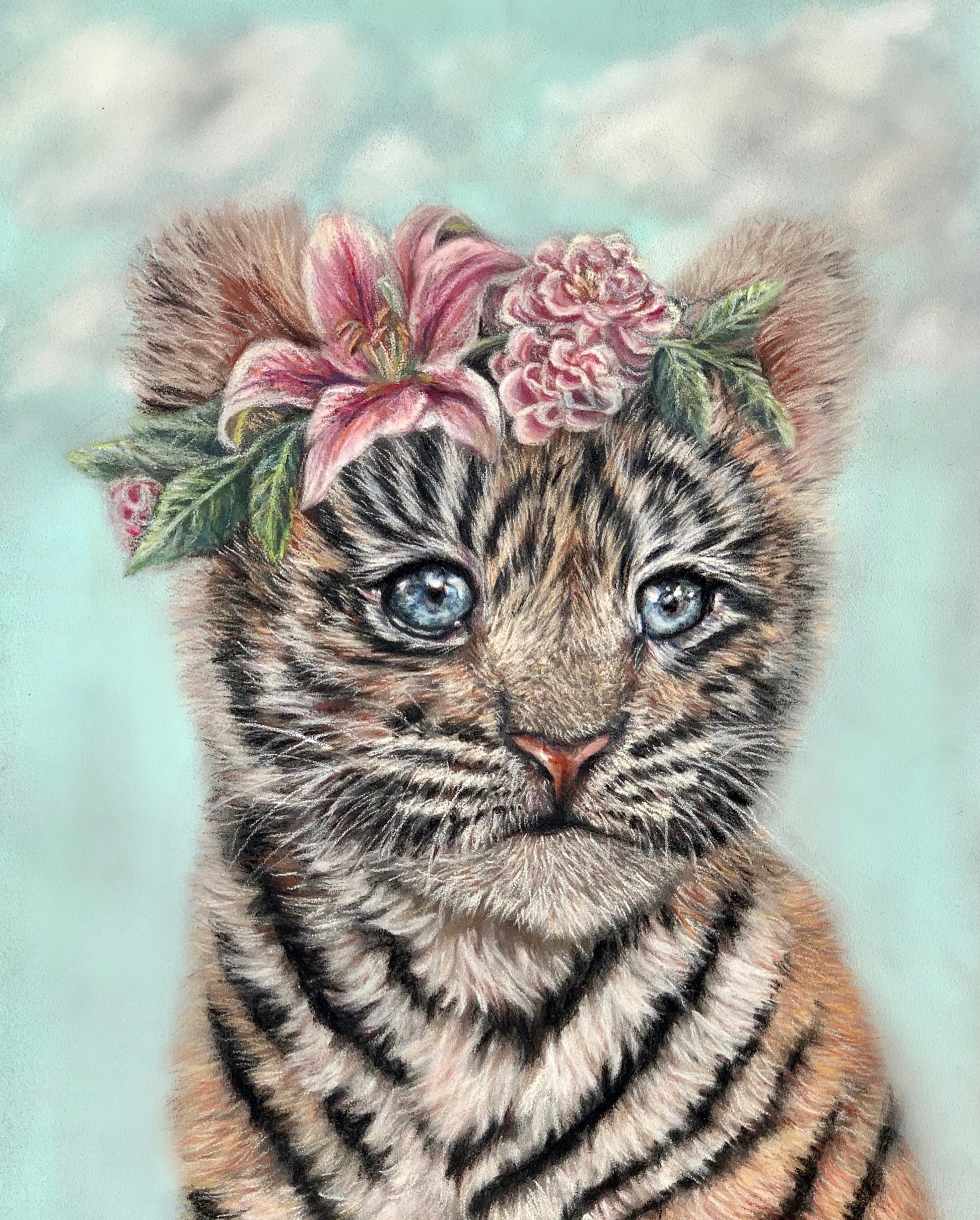 Introducing “Tiger Lily!” This cute baby Tiger comes adorned with a lovely Tiger Lily crown. Choose from a white or blue sky background for your print, and mix and match with our "pink plume" and "zebra daisy" options for a wild and whimsical look.