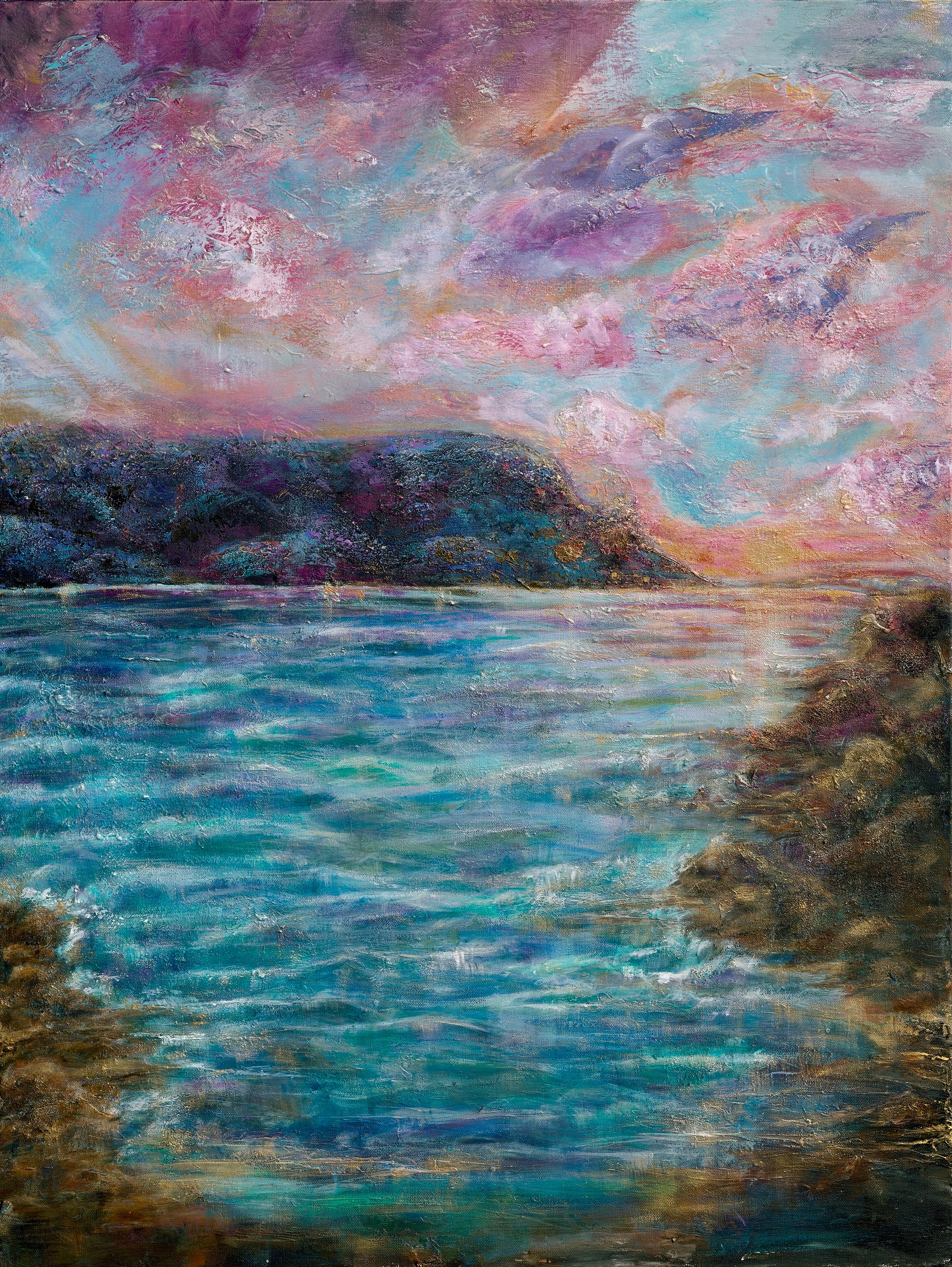 "Hanalei Bay” - Inspired by the stunning sunsets on the north shore of Kauai, HI overlooking Hanalei Bay. The warm/vibrant colors of the sky & sea create a sense of peacefulness, while the contrast between light/dark adds depth & dimension. This scene depicts nature’s ability to inspire awe and wonder in those who contemplate it.